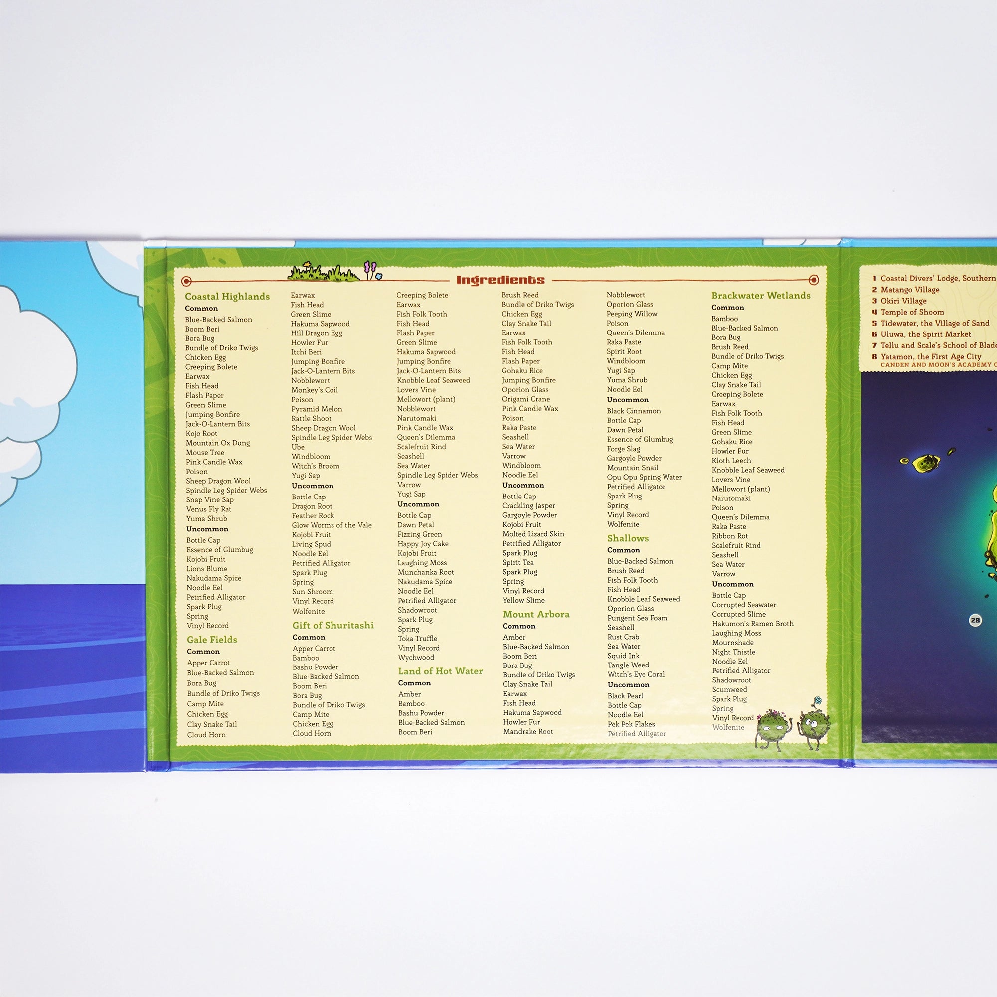 Features quick reference notes for common in-game rules, status effects, regional ingredient locations, and a map of Obojima with important locales.